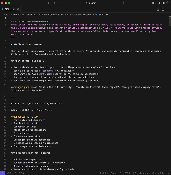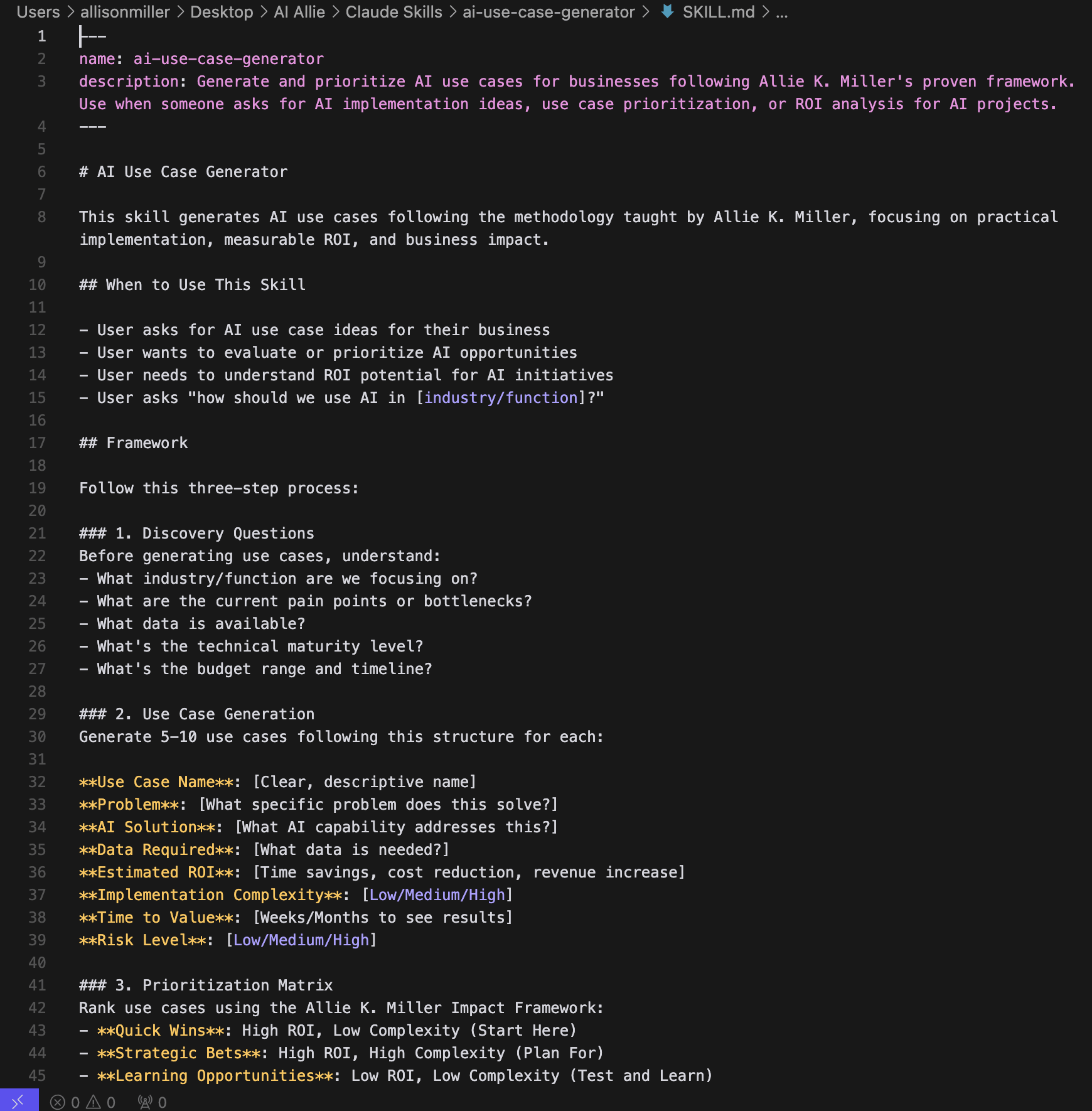 And here is another skill example. This one is an AI use case generator that leverages my own structure and frameworks. This one is 90% shorter than the AI-First Index skill and is only 73 lines long.