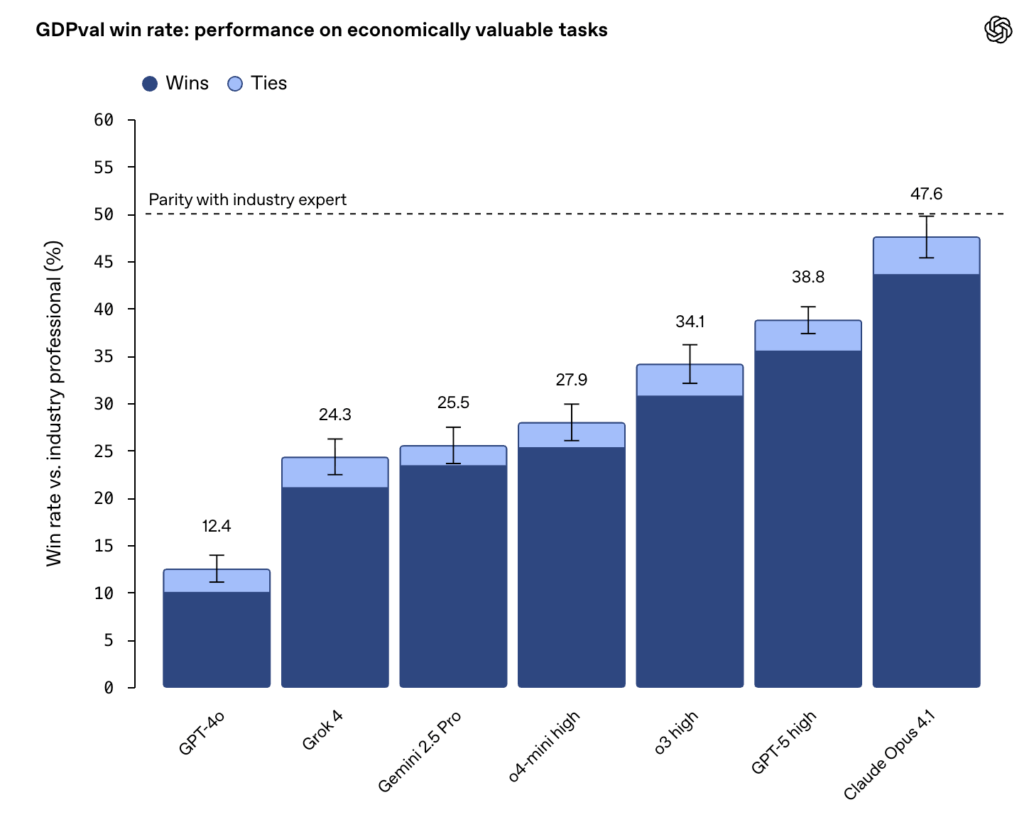 Takeaway: More and more headlines will center around the economic viability of AI models. GDPVal is just one of them. It is strange and off-putting to celebrate when a model gets better and better at replacing human work, but you can expect the measurements to continue. Start benchmarking your own roles against these models and keep a tracker. I lay out a whole method for this tracking in my AI-First Academy.