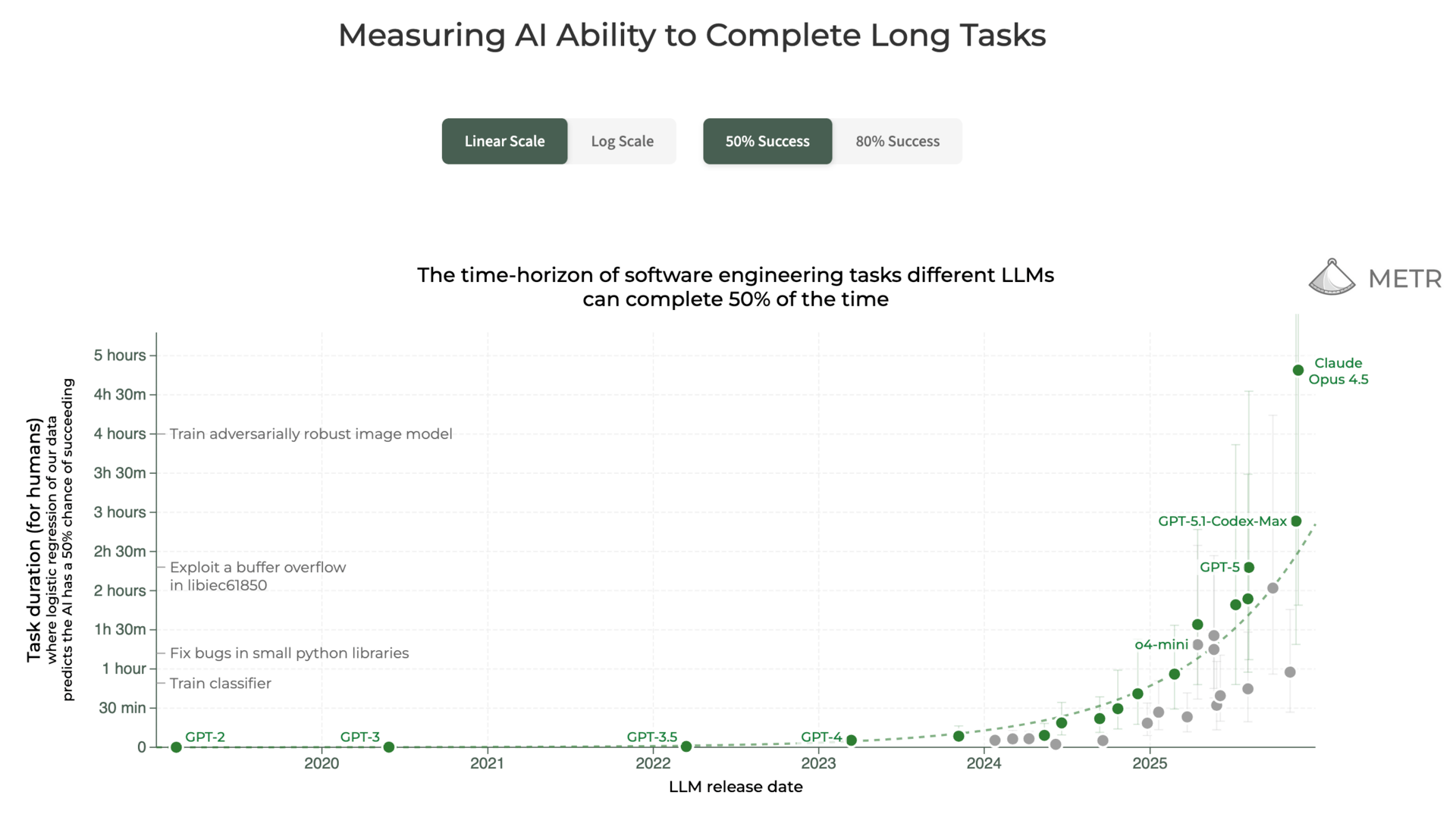 Add in the trendline from the famous METR study, and you've got a funky recipe brewing for 2026. The length of tasks AI agents can reliably complete has been ~doubling every seven months. Claude Opus 4.5 now sits at roughly 4.5-hour tasks (measured by how long those tasks take skilled humans)—up from ~50 minutes just earlier this year. And if you look at the graph, we’ve moved from "fix a small bug" territory to "train adversarially robust image model" territory. Extrapolate that curve and you hit the equivalent of multi-workday autonomous projects at 50% success in 12-18 months.