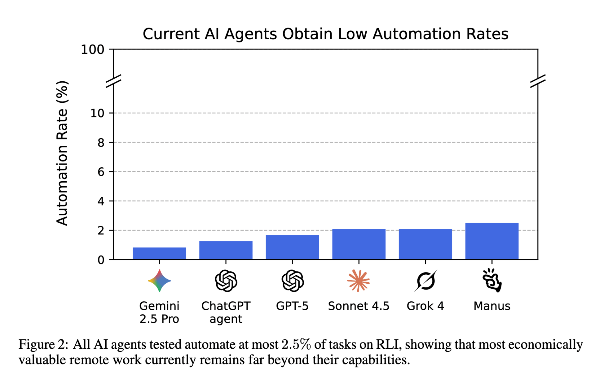 Frontier models are approaching expert-level performance on many tasks. Performance more than doubled from GPT-4o to GPT-5. Gemini 3 Pro score 53.5%, Claude Opus 4.5 achieved a 59.6%, GPT-5.2 Thinking hit 70.9%. And yet, on the flip side, the Remote Labor Index from Scale AI says the most capable models (as of writing, their paper did not yet include Claude Opus 4.5 or GPT-5.2 Thinking), the best models could only actually do 2.5% of human tasks found on Upwork.